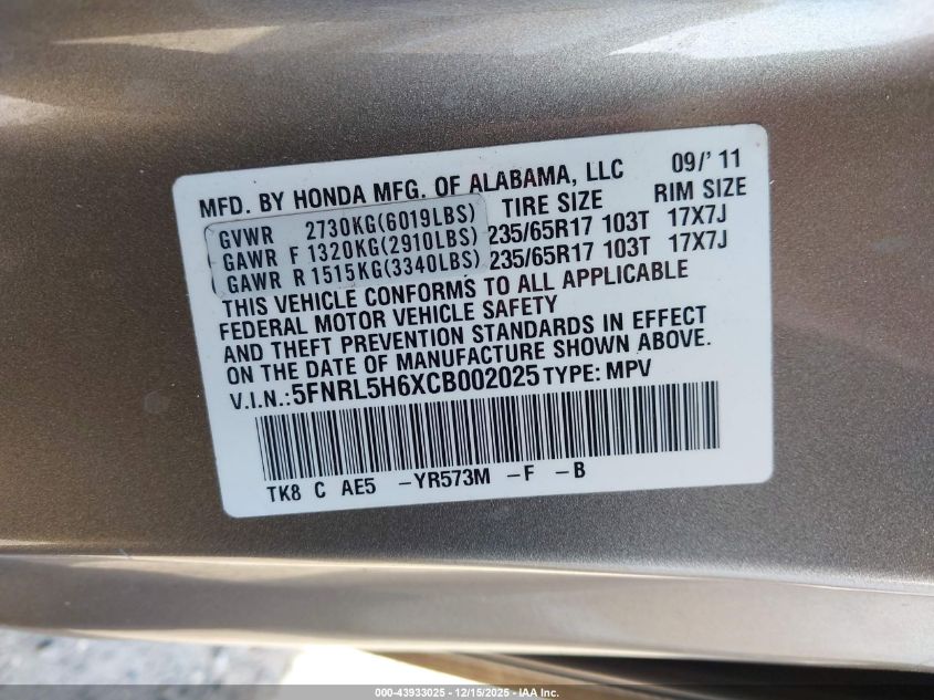 Колір ЗолотийЦиліндри 6Привід Передній привідVIN 5FNRL5H6XCB002025Стан СтаціонарноУшкодження Передня або задня