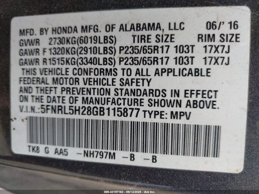 2016 HONDA ODYSSEY - 5FNRL5H28GB115877, колір - Сірий, 3.5, Бензин, Передній привід із США