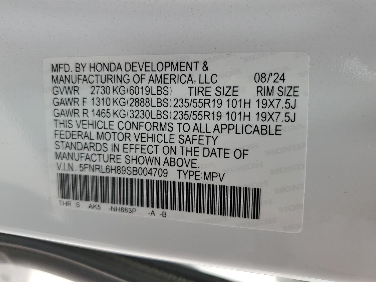 Колір БілийЦиліндри 6VIN 5FNRL6H89SB004709Стан ЗаводитьсяУшкодження Передня або задняДата аукціона 2025-10-10