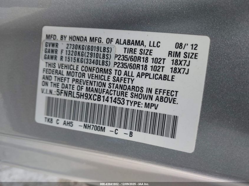 Колір СрібнийЦиліндри 6Привід Передній привідVIN 5FNRL5H9XCB141453Стан СтаціонарноУшкодження Права сторона