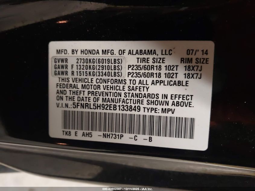Колір ЧорнийЦиліндри 6Привід Передній привідVIN 5FNRL5H92EB133849Стан Заводиться та їде (перевірено)Ушкодження Права сторона