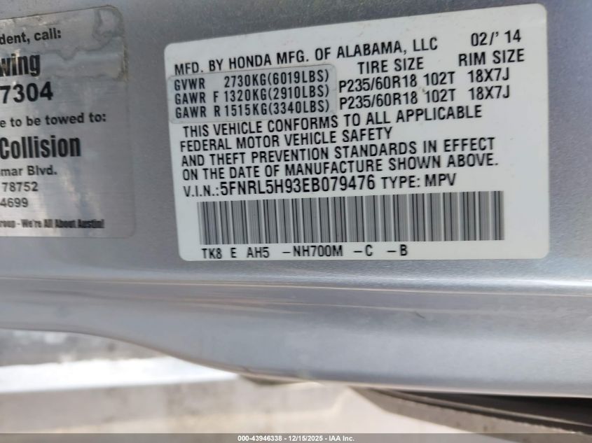 2014 HONDA ODYSSEY - 5FNRL5H93EB079476, колір - Срібний, 3.5, Бензин, Передній привід із США