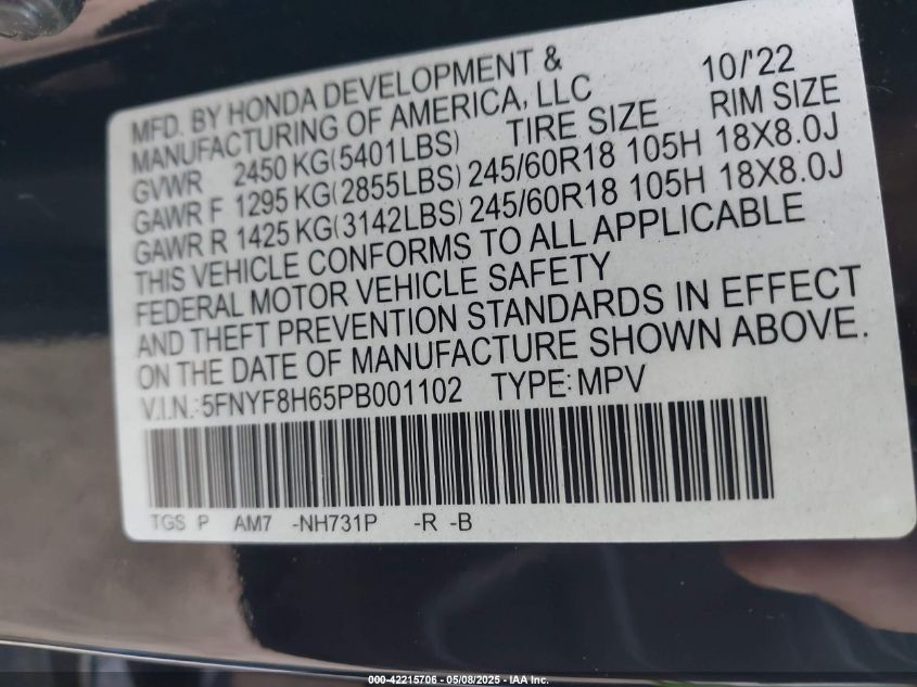 Колір ЧорнийЦиліндри 6Привід Повний привідVIN 5FNYF8H65PB001102Стан СтаціонарноУшкодження Права сторона
