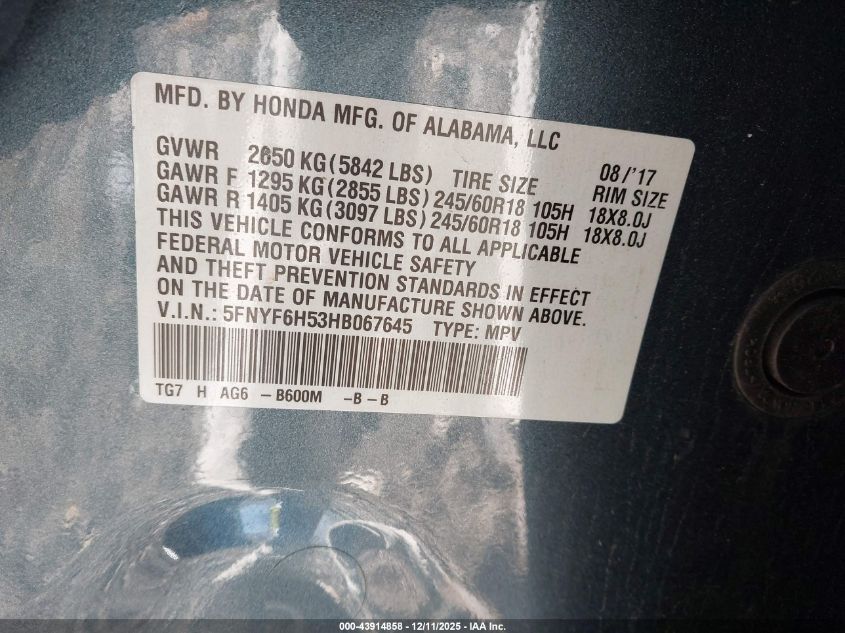 2017 HONDA PILOT - 5FNYF6H53HB067645, колір - Синій, 3.5, Бензин, Повний привід із США