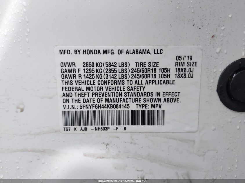 2019 HONDA PILOT - 5FNYF6H44KB084145, колір - Білий, 3.5, Бензин, Повний привід із США