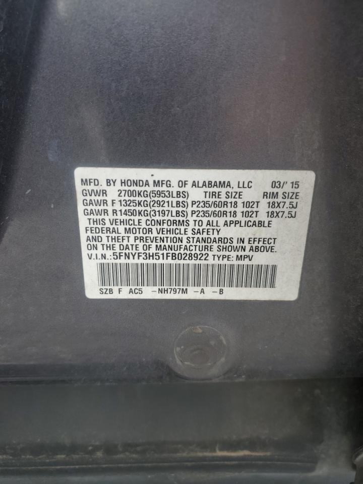 2015 HONDA PILOT - 5FNYF3H51FB028922, колір - Сірий, 3.5, Бензин, із США