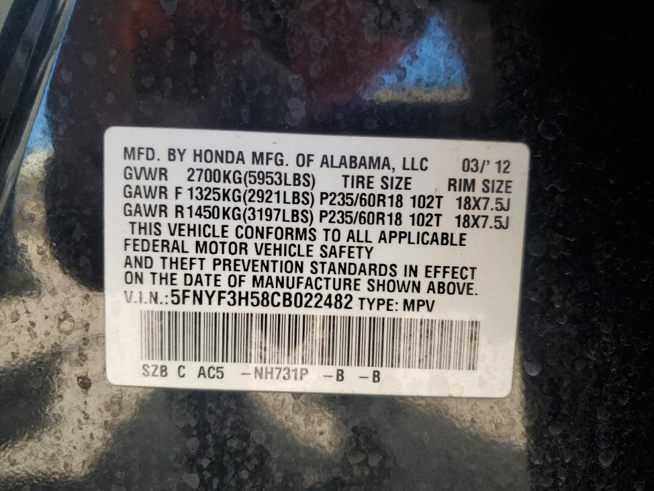 Колір ЧорнийЦиліндри 6VIN 5FNYF3H58CB022482Стан ЗаводитьсяУшкодження Задня