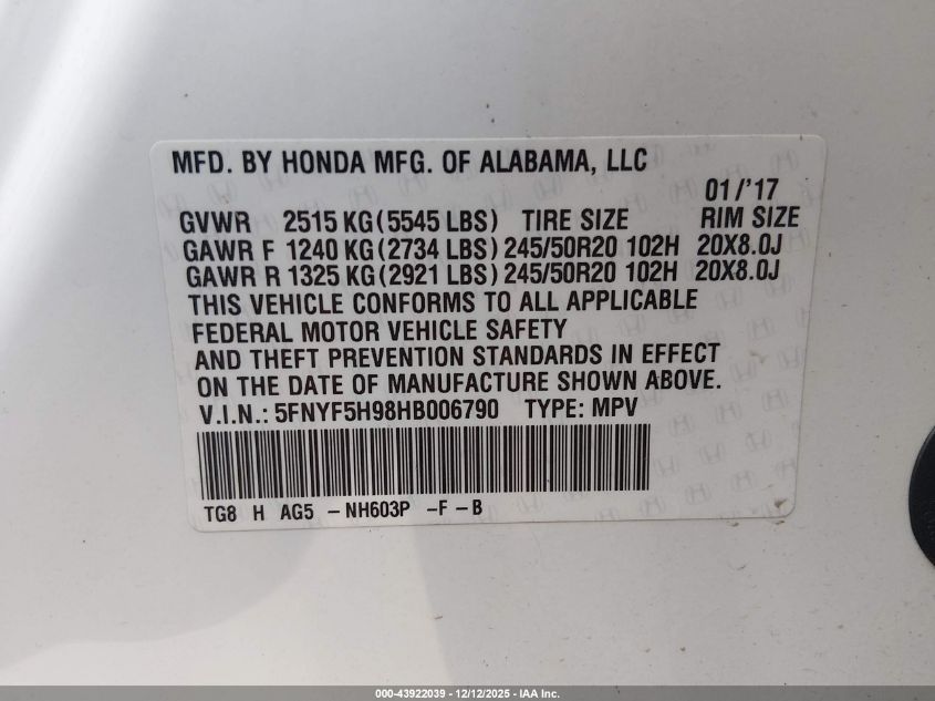 2017 HONDA PILOT - 5FNYF5H98HB006790, колір - Білий, 3.5, Бензин, Передній привід із США