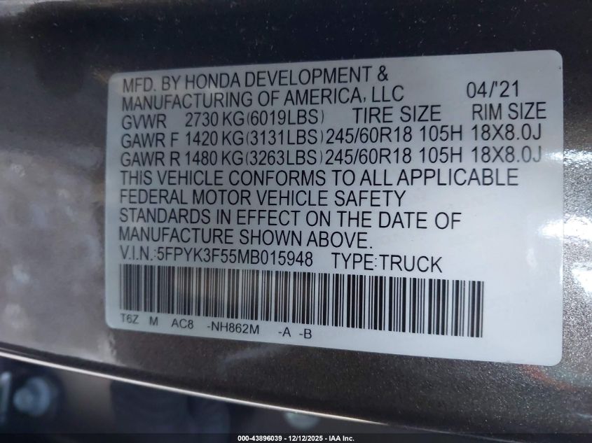2021 HONDA RIDGELINE - 5FPYK3F55MB015948, колір - Коричневий, 3.5, Бензин, Повний привід із США