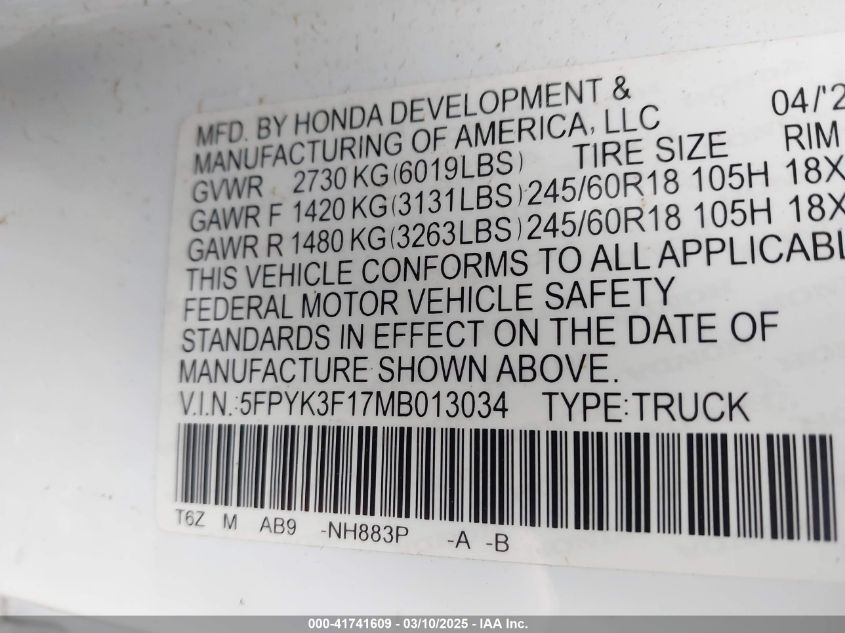 Колір БілийЦиліндри 6Привід Повний привідVIN 5FPYK3F17MB013034Стан Заводиться та їде (перевірено)Ушкодження Через негодуДата аукціона 2025-12-19