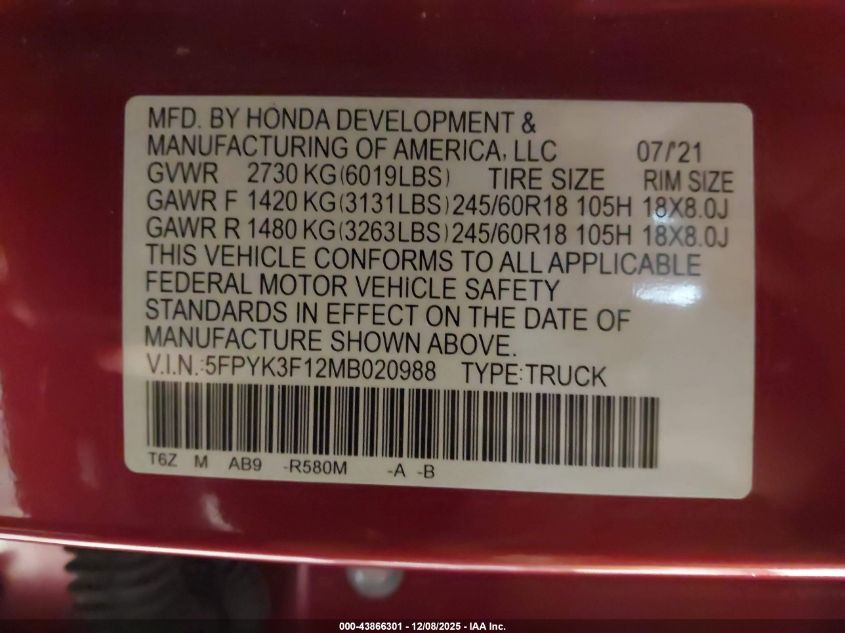 2021 HONDA RIDGELINE - 5FPYK3F12MB020988, колір - Червоний, 3.5, Бензин, Повний привід із США