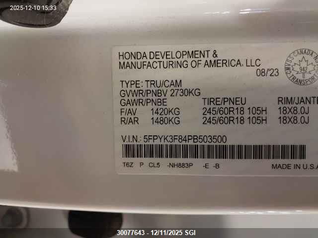 2023 HONDA RIDGELINE - 5FPYK3F84PB503500, колір - Білий, , Бензин, Повний привід із США