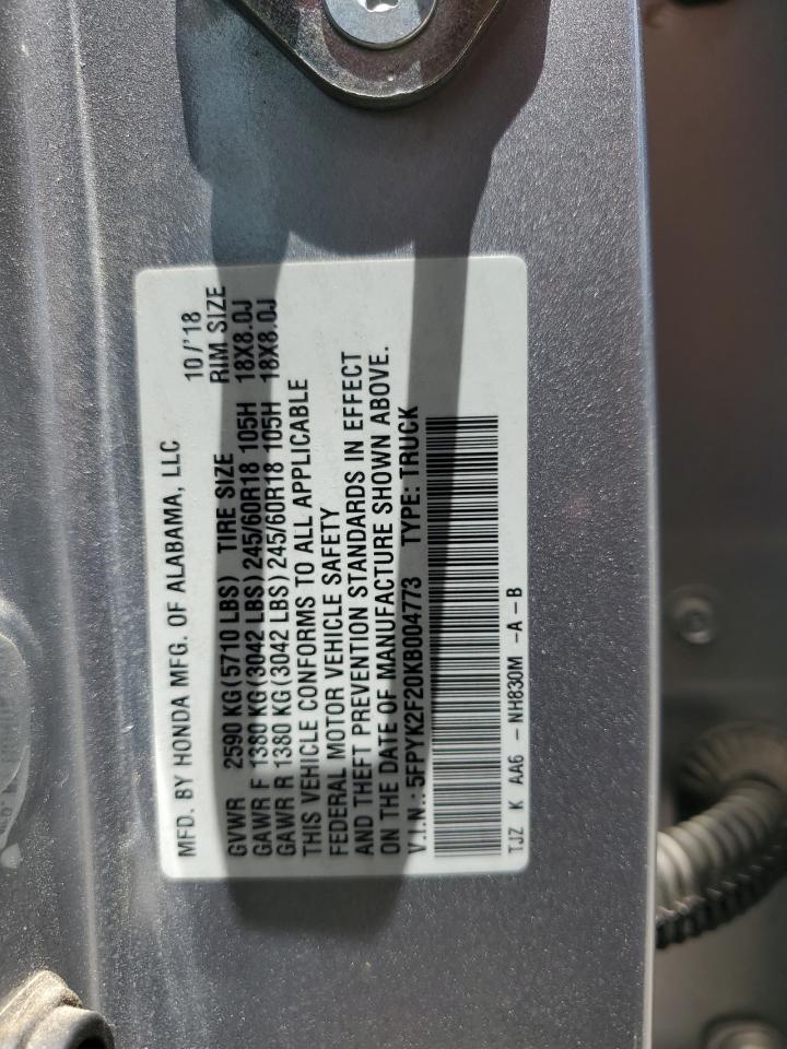 2019 HONDA RIDGELINE - 5FPYK2F20KB004773, колір - Срібний, 3.5, Бензин, із США