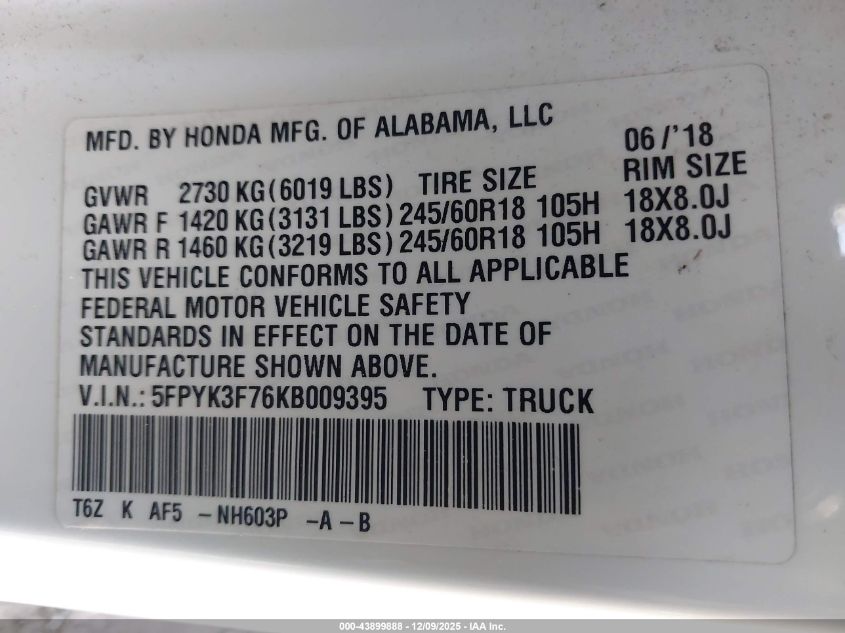 2019 HONDA RIDGELINE RTL