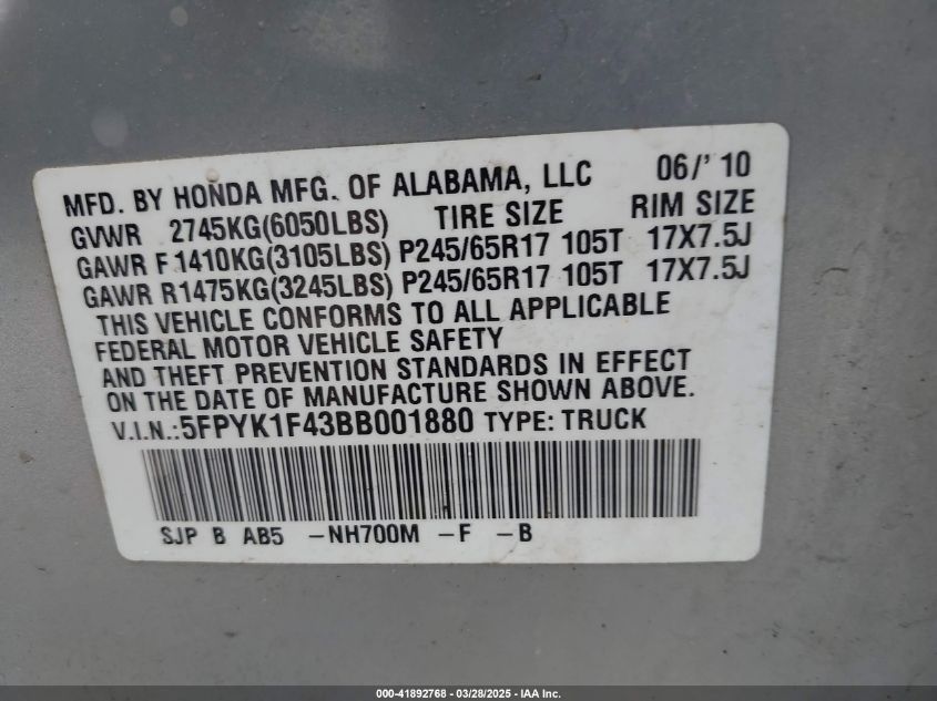 Колір СрібнийЦиліндри 6Привід Повний привідVIN 5FPYK1F43BB001880Стан Заводиться та їде (перевірено)Ушкодження Передня або задня
