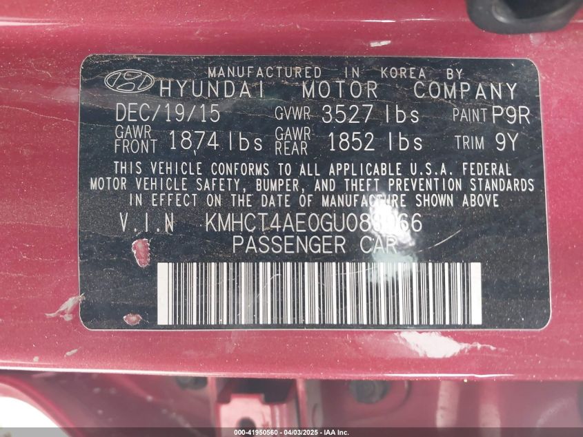 Колір ЧервонийЦиліндри 4Привід Передній привідVIN KMHCT4AE0GU083966Стан СтаціонарноУшкодження Незначні