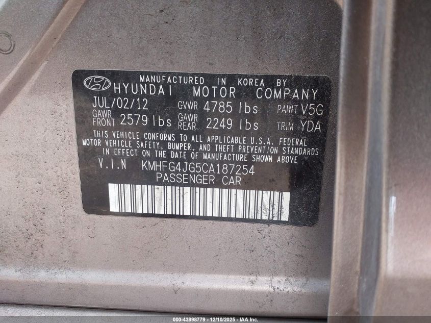 2012 HYUNDAI AZERA - KMHFG4JG5CA187254, колір - Шампань, 3.3, Бензин, Передній привід із США
