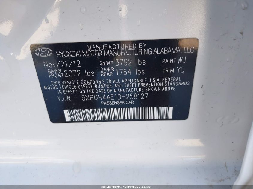 2013 HYUNDAI ELANTRA - 5NPDH4AE1DH258127, колір - Білий, 1.8, Бензин, Передній привід із США