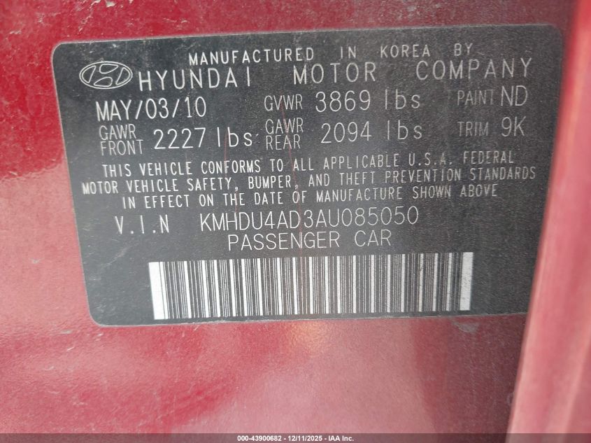 2010 HYUNDAI ELANTRA - KMHDU4AD3AU085050, колір - Червоний, 2.0, Бензин, Передній привід із США