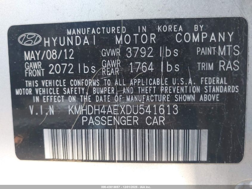 2013 HYUNDAI ELANTRA - KMHDH4AEXDU541613, колір - Срібний, 1.8, Бензин, Передній привід із США