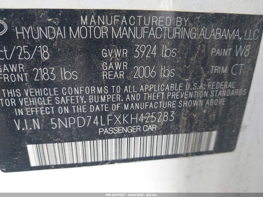 2019 HYUNDAI ELANTRA - 5NPD74LFXKH425283, колір - Білий, 2.0, Бензин, Передній привід із США