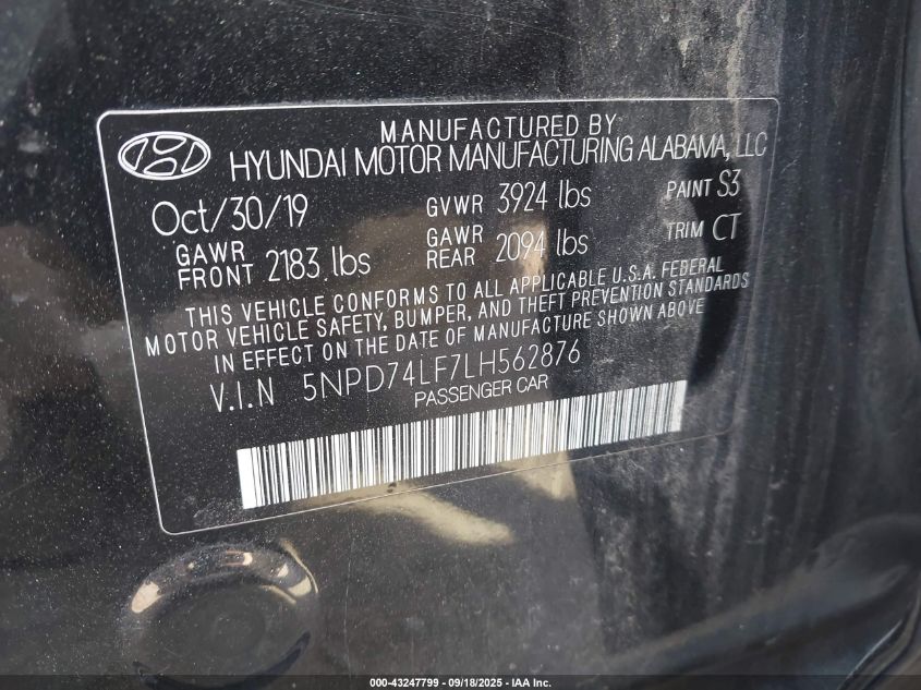 2020 HYUNDAI ELANTRA - 5NPD74LF7LH562876, колір - Чорний, 2.0, Бензин, Передній привід із США