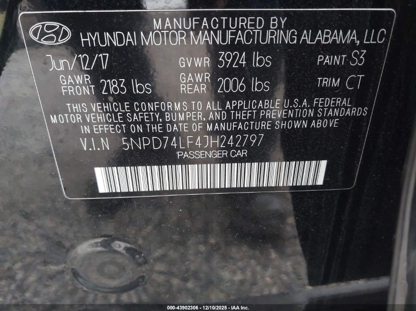 2018 HYUNDAI ELANTRA - 5NPD74LF4JH242797, колір - Чорний, 2.0, Бензин, Передній привід із США