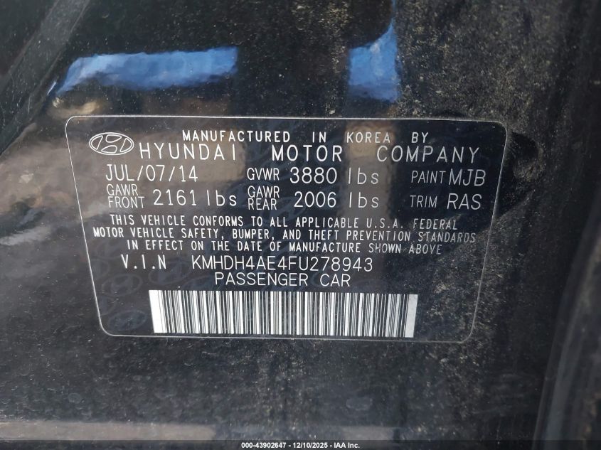 2015 HYUNDAI ELANTRA - KMHDH4AE4FU278943, колір - Чорний, 1.8, Бензин, Передній привід із США