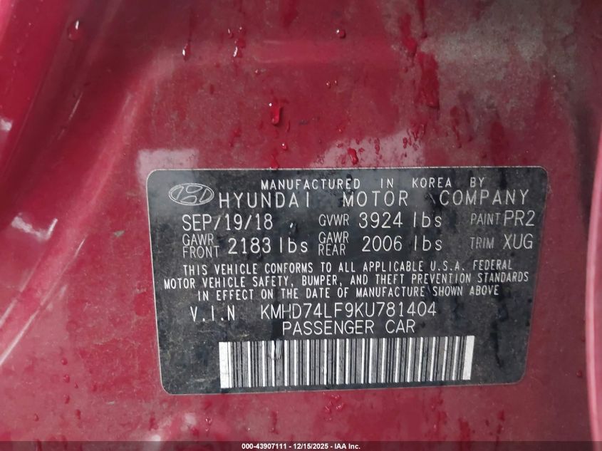2019 HYUNDAI ELANTRA - KMHD74LF9KU781404, колір - Червоний, 2.0, Бензин, Передній привід із США