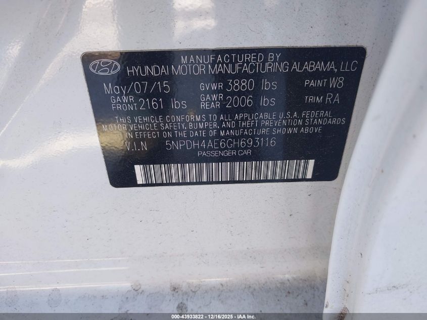 2016 HYUNDAI ELANTRA - 5NPDH4AE6GH693116, колір - , 1.8, Бензин, Передній привід із США