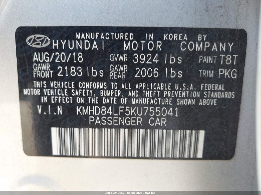 2019 HYUNDAI ELANTRA - KMHD84LF5KU755041, колір - Срібний, 2.0, Бензин, Передній привід із США
