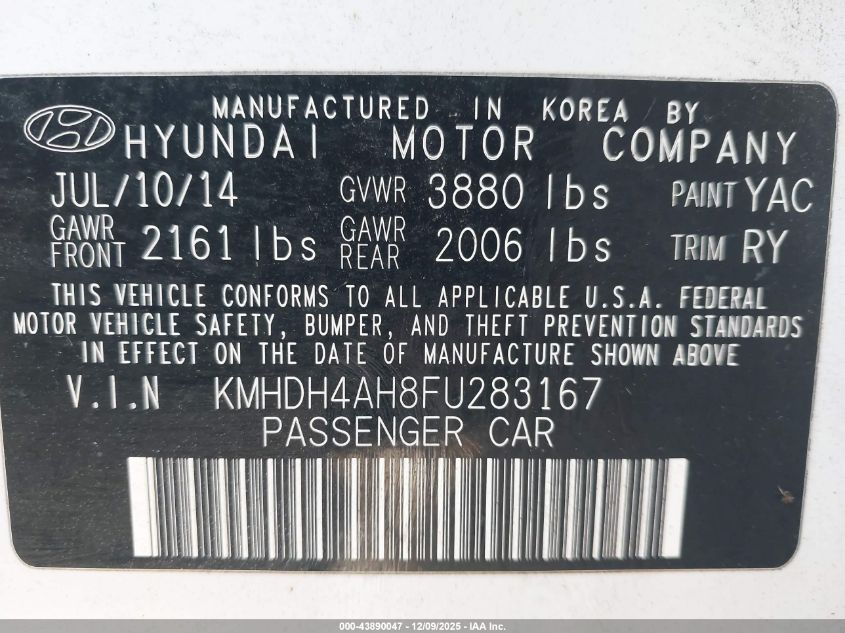 2015 HYUNDAI ELANTRA - KMHDH4AH8FU283167, колір - Білий, 2.0, Бензин, Передній привід із США
