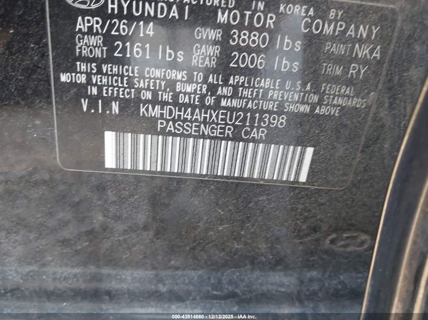 2014 HYUNDAI ELANTRA - KMHDH4AHXEU211398, колір - Чорний, 2.0, Бензин, Передній привід із США