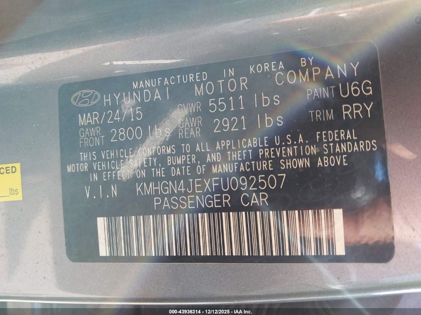2015 HYUNDAI GENESIS - KMHGN4JEXFU092507, колір - Синій, 3.8, Бензин, Повний привід із США