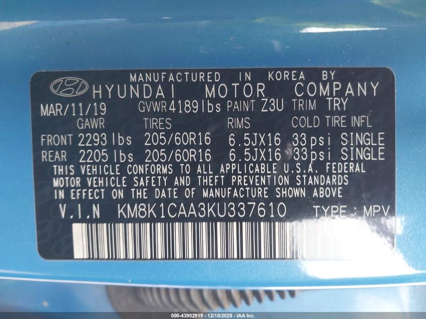 2019 HYUNDAI KONA - KM8K1CAA3KU337610, колір - Синій, 2.0, Бензин, Повний привід із США