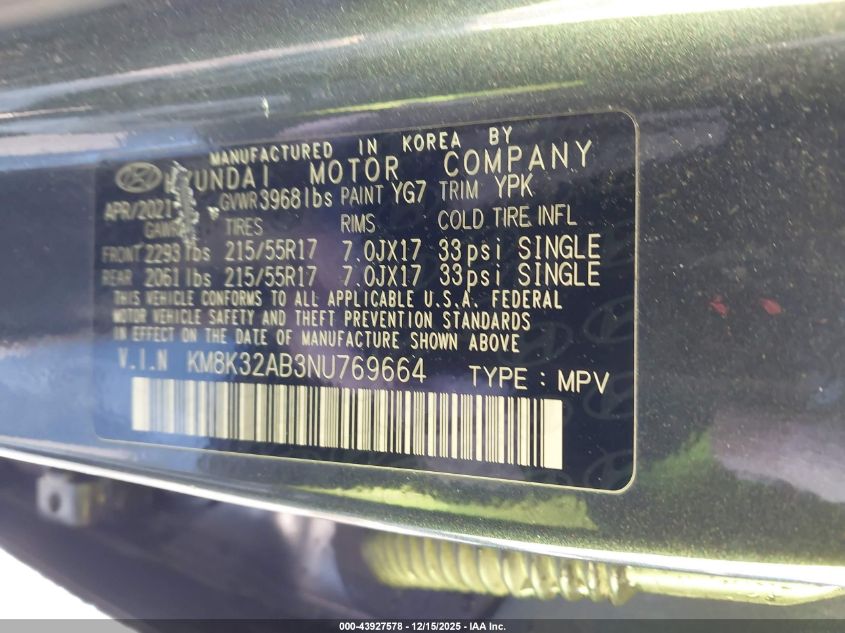 2022 HYUNDAI KONA - KM8K32AB3NU769664, колір - Сірий, 2.0, Бензин, Передній привід із США