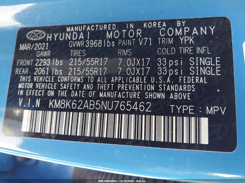 2022 HYUNDAI KONA - KM8K62AB5NU765462, колір - Синій, 2.0, Бензин, Передній привід із США