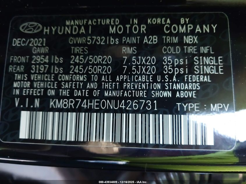 2022 HYUNDAI PALISADE - KM8R74HE0NU426731, колір - , 3.8, Бензин, Передній привід із США
