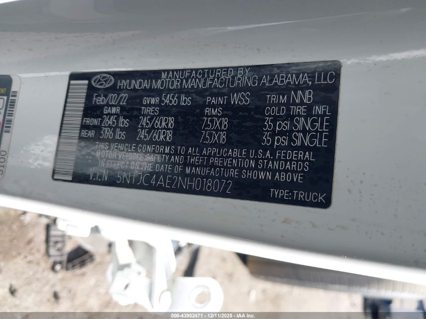 2022 HYUNDAI SANTA CRUZ - 5NTJC4AE2NH018072, колір - Білий, 2.5, Бензин, Передній привід із США
