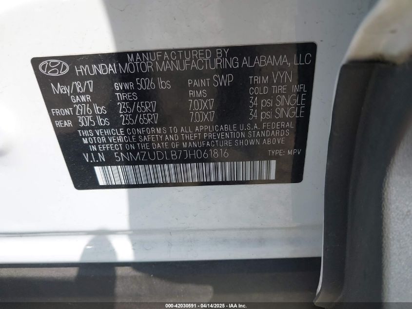 2018 HYUNDAI SANTA FE - 5NMZUDLB7JH061816, колір - Білий, 2.4, Бензин, Повний привід із США