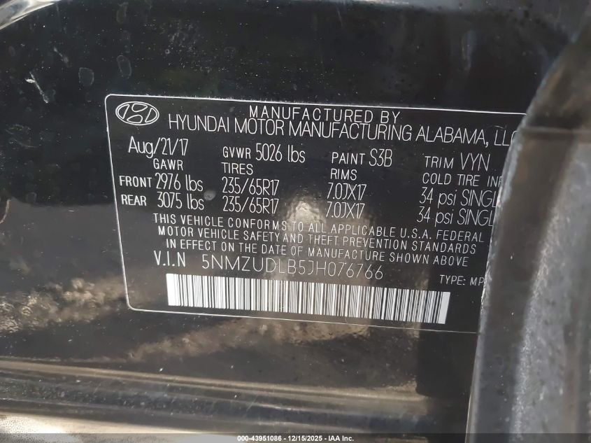 2018 HYUNDAI SANTA FE - 5NMZUDLB5JH076766, колір - Чорний, 2.4, Бензин, Повний привід із США