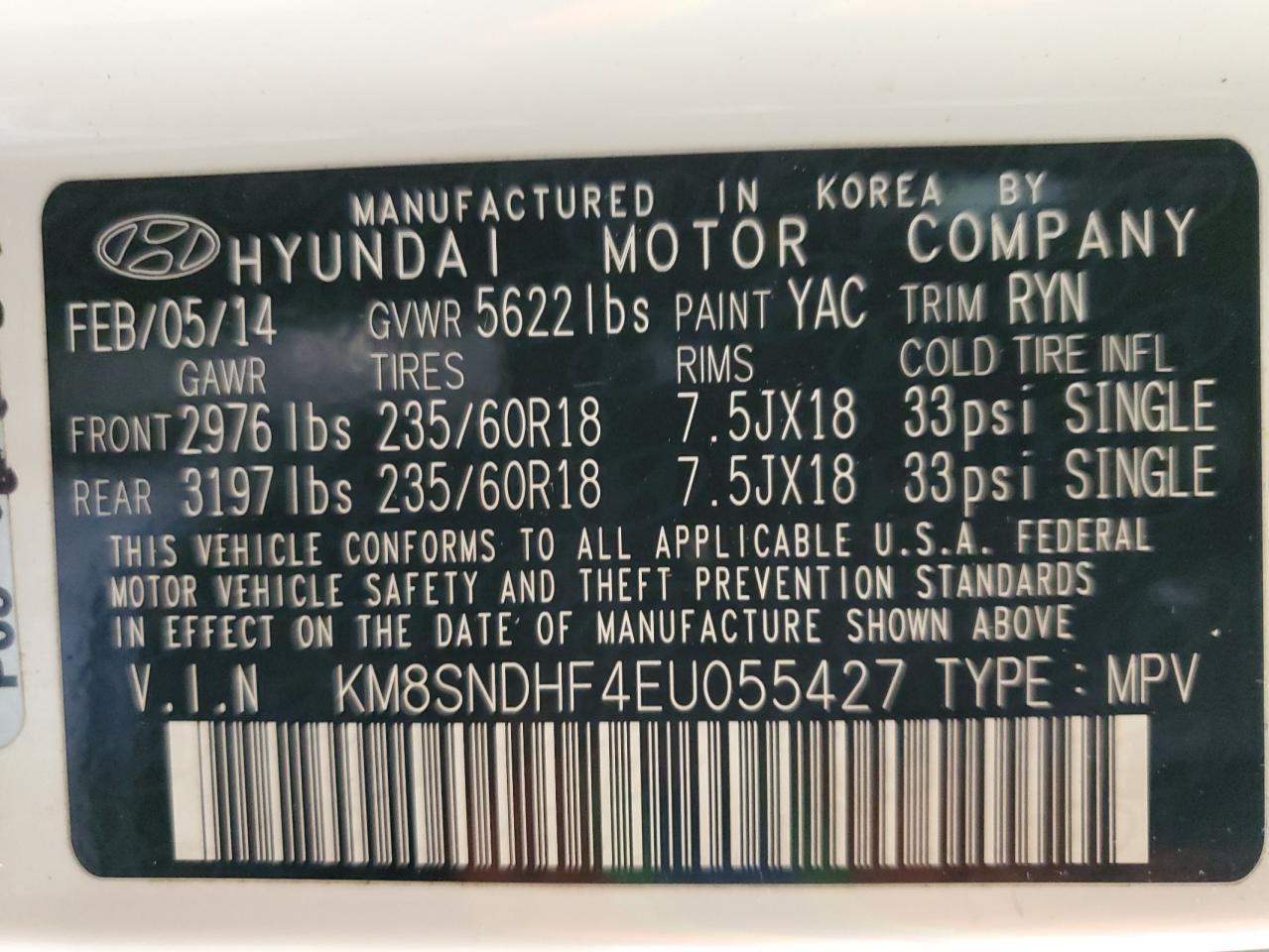 2014 HYUNDAI SANTA FE - KM8SNDHF4EU055427, колір - Білий, 3.3, Бензин, Повний привід із США