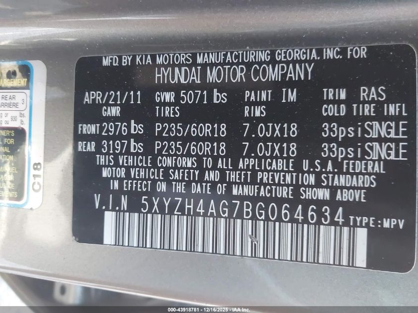 2011 HYUNDAI SANTA FE - 5XYZH4AG7BG064634, колір - , 3.5, Бензин, Передній привід із США