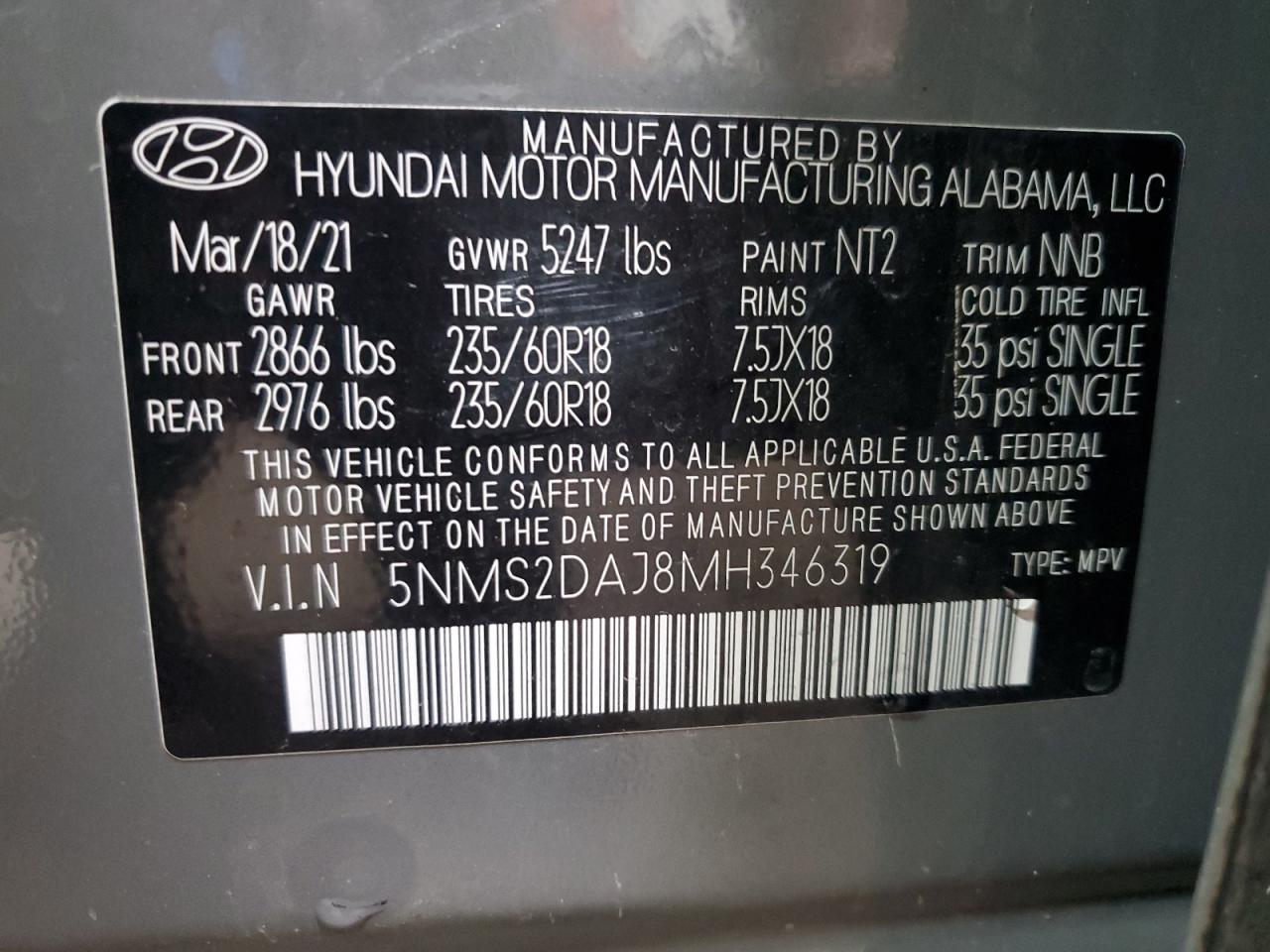 2021 HYUNDAI SANTA FE - 5NMS2DAJ8MH346319, колір - Сірий, 2.5, Бензин, Повний привід із США
