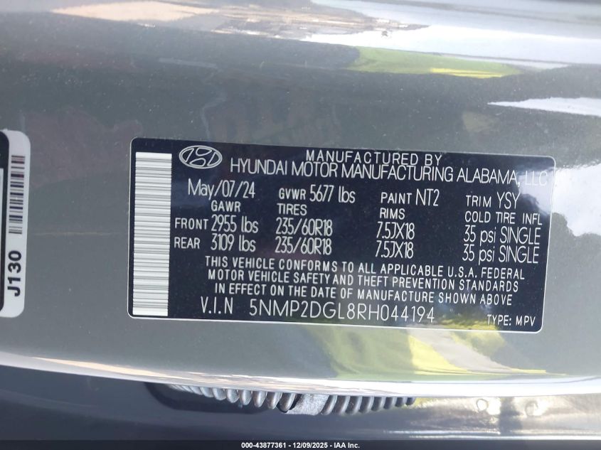 2024 HYUNDAI SANTA FE - 5NMP2DGL8RH044194, колір - Сірий, 2.5, Бензин, Повний привід із США