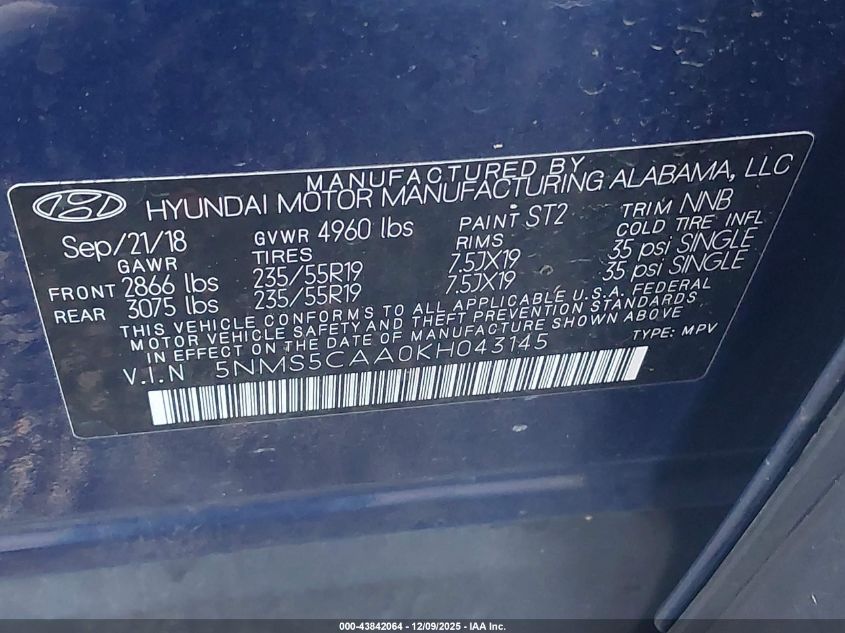 2019 HYUNDAI SANTA FE - 5NMS5CAA0KH043145, колір - Синій, 2.0, Бензин, Повний привід із США