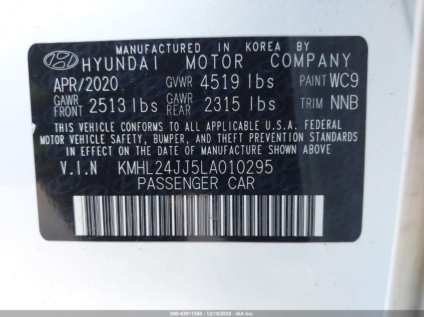 2020 HYUNDAI SONATA - KMHL24JJ5LA010295, колір - Білий, 2.0, Гібрид, Передній привід із США
