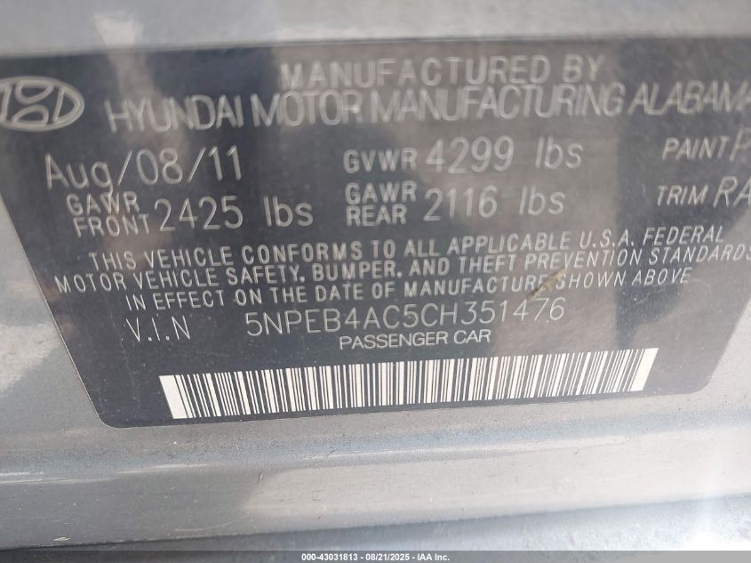 2012 HYUNDAI SONATA - 5NPEB4AC5CH351476, колір - Сірий, 2.4, Бензин, Передній привід із США