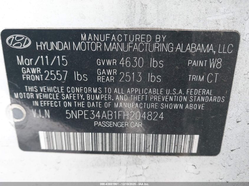 2015 HYUNDAI SONATA - 5NPE34AB1FH204824, колір - Білий, 2.0, Бензин, Передній привід із США