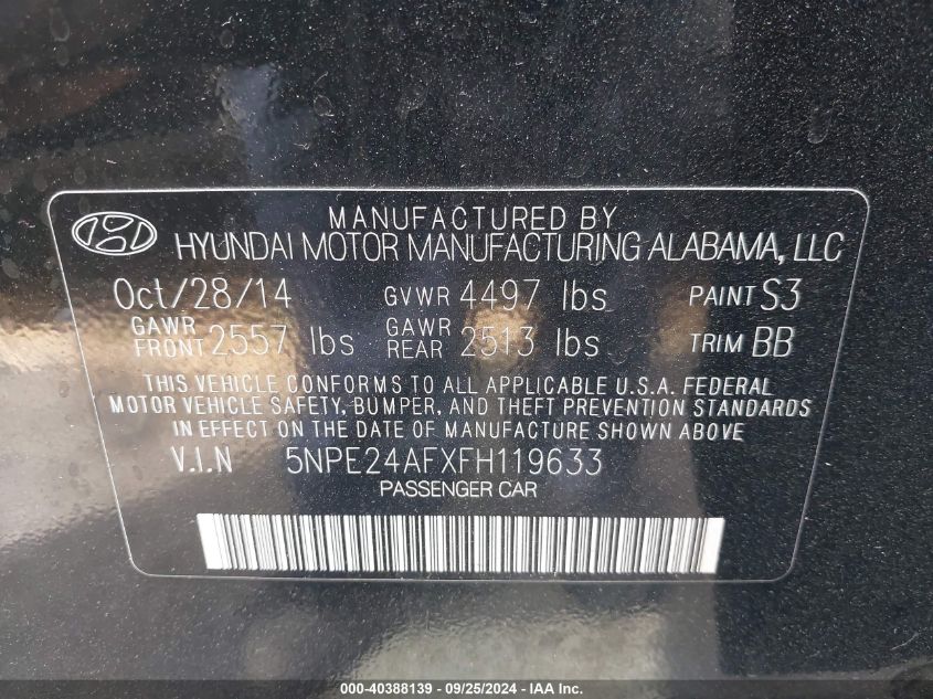2015 HYUNDAI SONATA - 5NPE24AFXFH119633, колір - Чорний, 2.4, Бензин, Передній привід із США